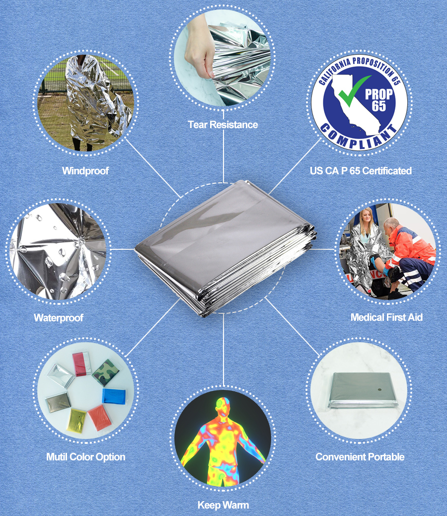 Our emergency blanket is a strong aluminum reflective material. It’s capable of reflecting upwards of 90 percent body heat while offering waterproof, windproof protection from rain, snow, moisture, cold, and heat. Our blanket has passed the California Proposition 65 testing. We accept customized packaging, different sizes, color and printing, etc