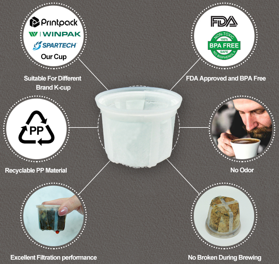 Our Filter is made of food-grade PP non-woven fabric. It is non-toxic, safe and easy to use. It can be used with PP K-Cup as filter for Keurig Machine.