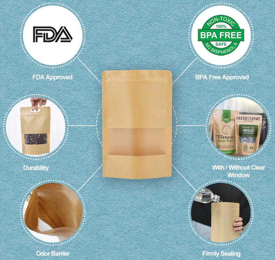 Our kraft bags are made from Kraft paper with an inner lining to protect food, and with PET or MOPP on the surface. Available with a clear PET window and a gusset base that allows the bag to stand on its bottom, perfect for presentation. Also they are recyclable after use which are more eco-friendly.