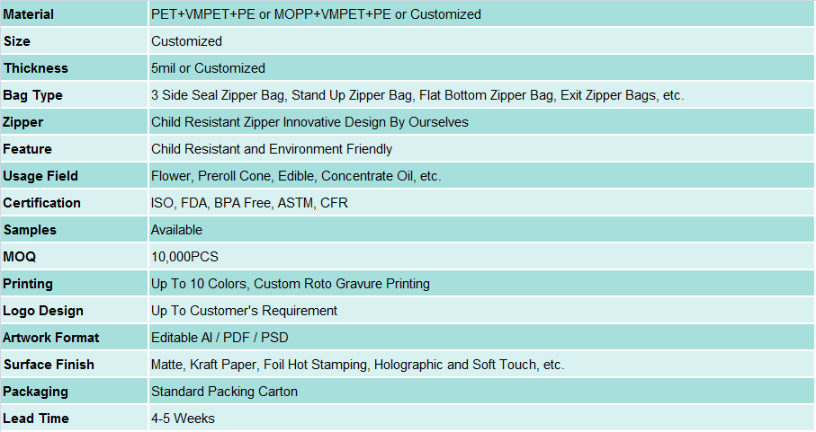 Our premium certified Child Resistant Grip N Pull Bags are perfect for transportation and storing of cannabis products. These bags meet state requirement for child resistant packaging and pass the testing of CFR 1700.20. They have become the most cost-effective choice for multiple applications such as flower, concentrate oil, edible, preroll cone, etc. We accept customized printing for different sizes and material.