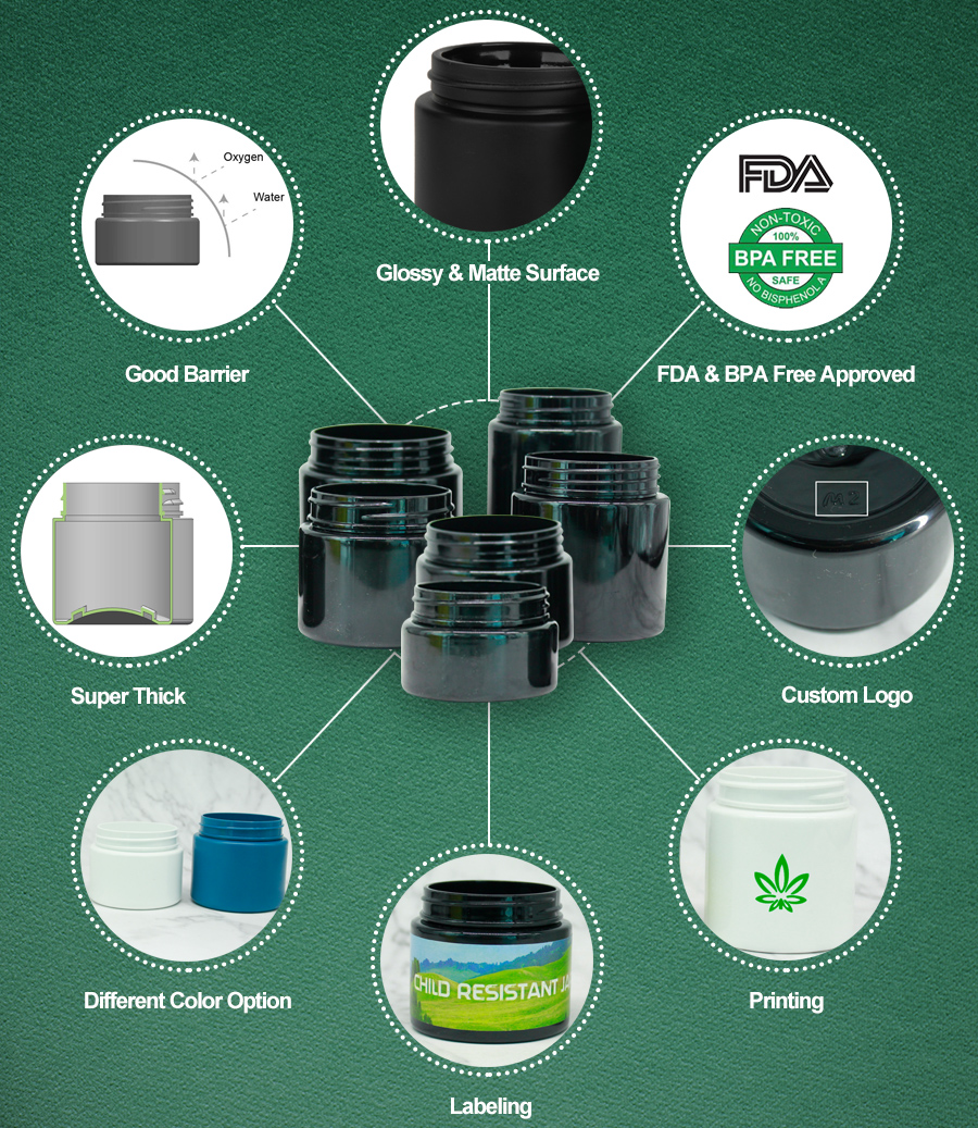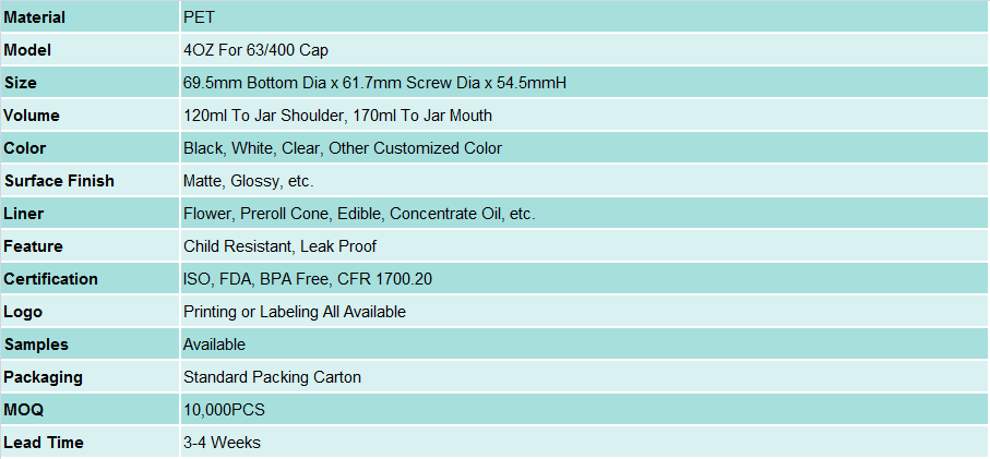 Our premium certified 63/400 4OZ PET Jars are perfect for transportation and storing of cannabis products. These jars meet state requirement for child resistant packaging and pass the testing of CFR 1700.20. They have become the most cost-effective choice for multiple applications such as flower, concentrate oil, edible, preroll cone, etc. We accept customized printing for different color, printing and labeling, etc.