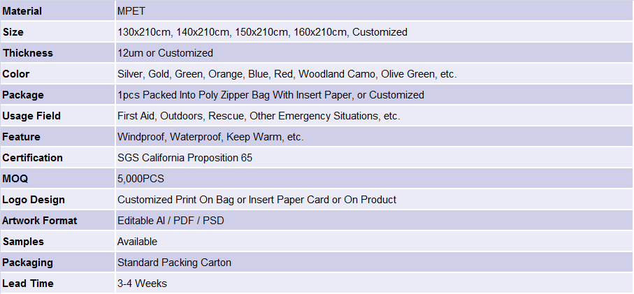Our Blue Emergency Blanket is a strong aluminum reflective material. It’s capable of reflecting upwards of 90 percent body heat while offering waterproof, windproof protection from rain, snow, moisture, cold, and heat. Our blanket has passed the California Proposition 65 testing. We accept customized packaging, different sizes, color and printing, etc.