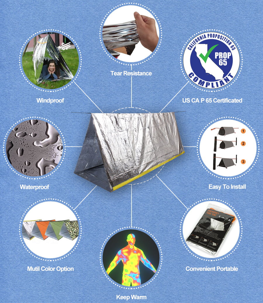 Our Silver Emergency Tent is a strong aluminum reflective material. It’s capable of reflecting upwards of 90 percent body heat while offering waterproof, windproof protection from rain, snow, moisture, cold, and heat. Our tent has passed the California Proposition 65 testing. We accept customized packaging, different sizes, color and printing, etc.