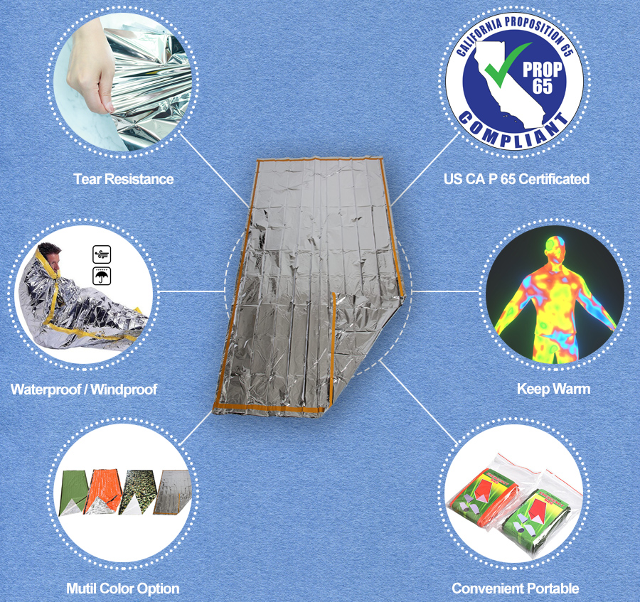 Our Silver Emergency Sleeping Bag is a strong aluminum reflective material. It’s capable of reflecting upwards of 90 percent body heat while offering waterproof, windproof protection from rain, snow, moisture, cold, and heat. Our sleeping bag has passed the California Proposition 65 testing. We accept customized packaging, different sizes, color and printing, etc.