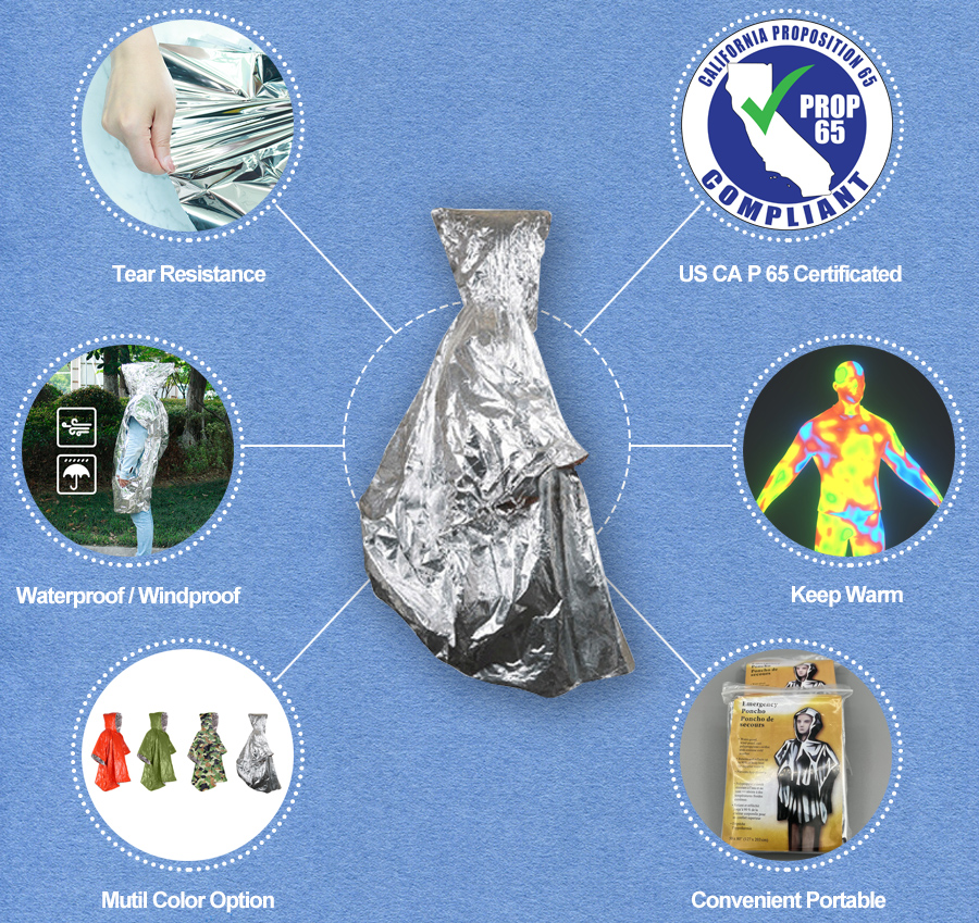 Our Silver Emergency Poncho is a strong aluminum reflective material. It’s capable of reflecting upwards of 90 percent body heat while offering waterproof, windproof protection from rain, snow, moisture, cold, and heat. We accept customized packaging, different sizes, color and printing, etc